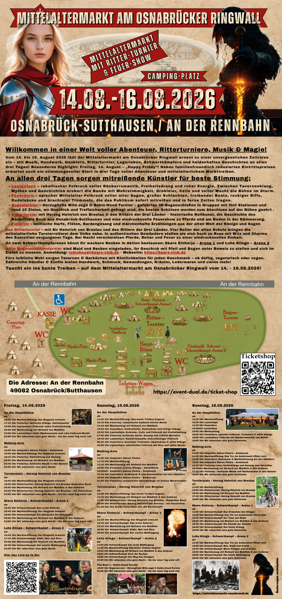 Wenn am dritten Augustwochenende der Schleier der Zeit gelüftet wird, verwandelt sich das Gelände an der Nahner Waldbahn in Osnabrück/Sutthausen erneut in ein lebendiges Abbild vergangener Jahrhunderte. Drei Tage lang erwarten euch Musik, Ritterturniere, Schwertkampf, Handwerk, Lagerleben, Händler, Tavernen und heldenhafte Geschichten – eingebettet in eine Atmosphäre voller Klang, Feuer und Abenteuer.